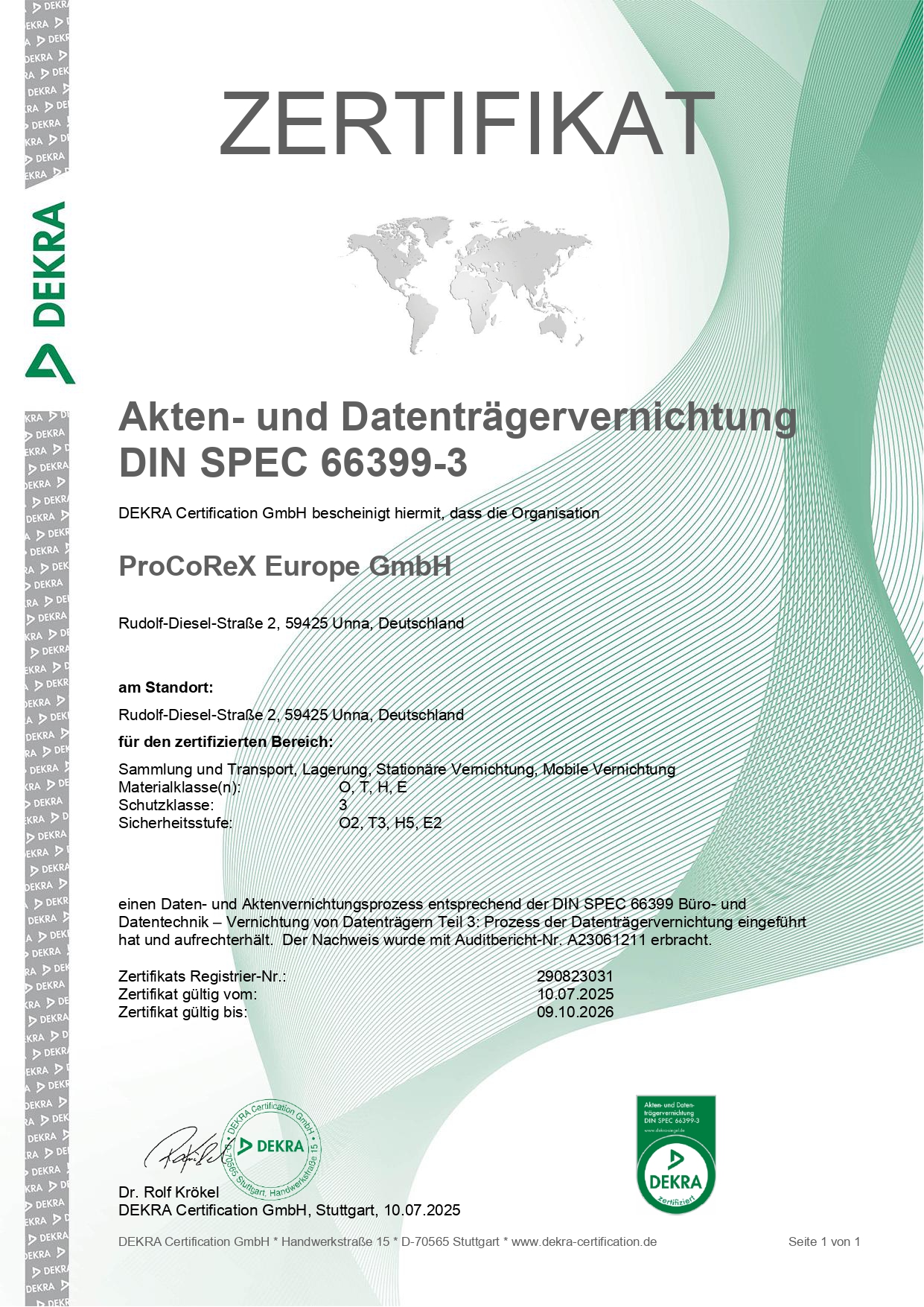 Die Einhaltung strengster Datenschutz- und Sicherheitsvorgaben ist durch die DIN 66399-Zertifizierung garantiert – alle Prozesse erfolgen transparent, zuverlässig und nach aktuellen Standards.