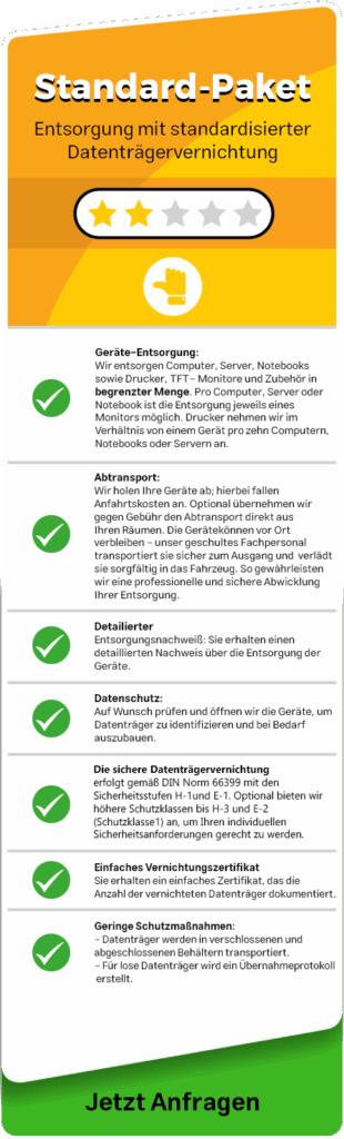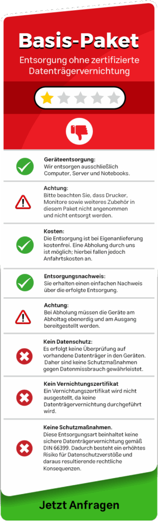 Für die reine Computer Entsorgung und Verwertung von IT-Endgeräten wie Computern, Notebooks oder Servern entstehen bei uns keine Kosten. Es wird lediglich die Abholung entsprechend der Entfernung berechnet. Die zertifizierte Datenträgervernichtung erfolgt separat und ist je nach Anforderung kostenfrei oder zum Festpreis erhältlich.