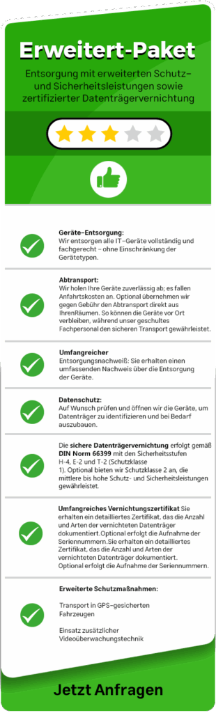 Unsere Schutzpakete im Bereich Computer Entsorgung richten sich nach den Vorgaben der DIN Norm 66399 und werden durch zusätzliche interne Sicherheitsstandards ergänzt. Dabei handelt es sich um eigens entwickelte Sicherheitsstufen, die auf der DIN Norm 66399 aufbauen, im Paket X jedoch durch weitere Anforderungen und Prozesse noch stärker ausgeprägt sind. So profitieren Sie von einem maximalen Schutz bei der Datenträgervernichtung. Diese erweiterten Maßnahmen gehen über die Vorgaben der DIN 66399 hinaus und gewährleisten somit höchste Sicherheit bei der Computer Entsorgung sensibler Daten.