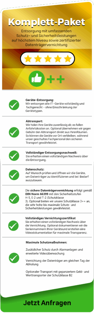 Jetzt unverbindlich informieren und ein individuelles Angebot für die Computer Entsorgung sowie die sichere Vernichtung von Festplatten und Datenträgern anfordern.